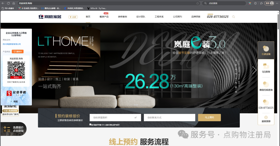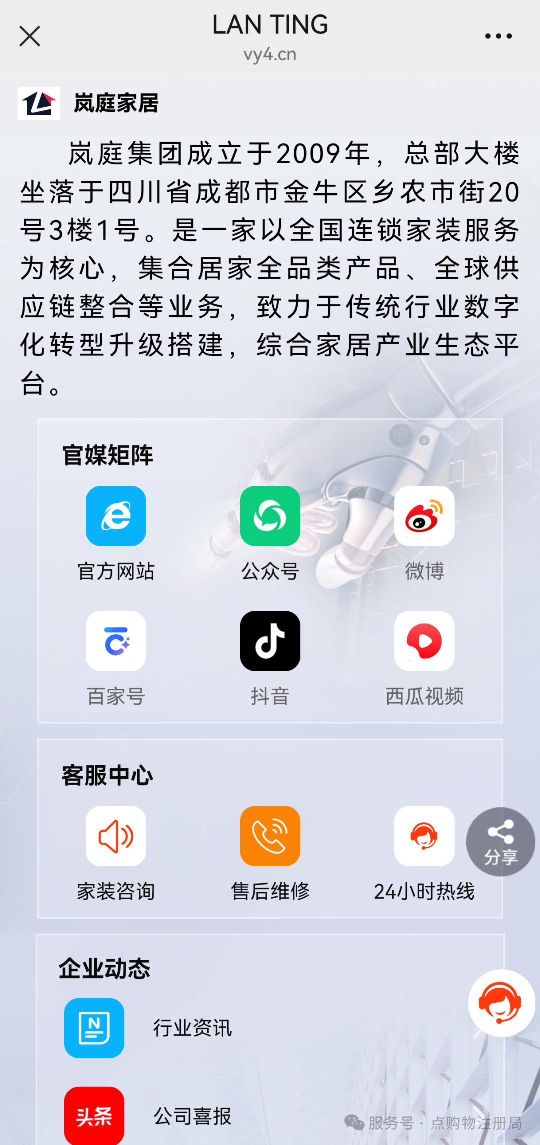 值得一提的是,岚庭家居同时也启用了公信导航,通过域名与导航的双重布局,构建起更立体的线上服务网络。用户可扫码或输入“岚庭家居.购物”直达导航页,获取官网、官媒矩阵、客服中心、企业动态信息,极大提升用户体验。